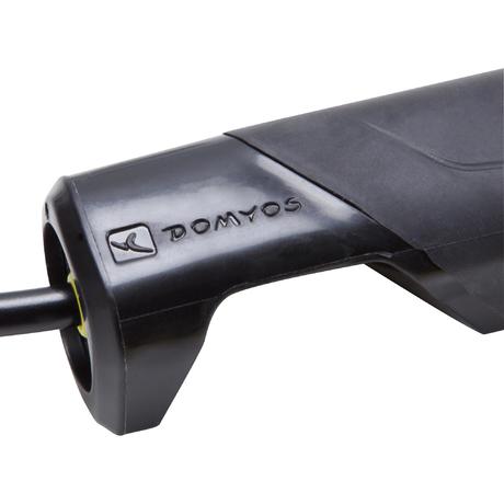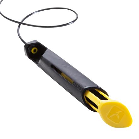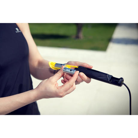 Je kunt tot 2 gewichtjes toevoegen (1 gewichtje = 75 g) per handgreep (de gewichtjes worden apart verkocht). Hiervoor draai je het springtouw zo dat je de gekleurde knop voor je hebt. Druk hierop: de houder klikt los. Stop een of twee gewichtjes in het vak van de houder. Steek tot slot de houder weer in de handgreep.